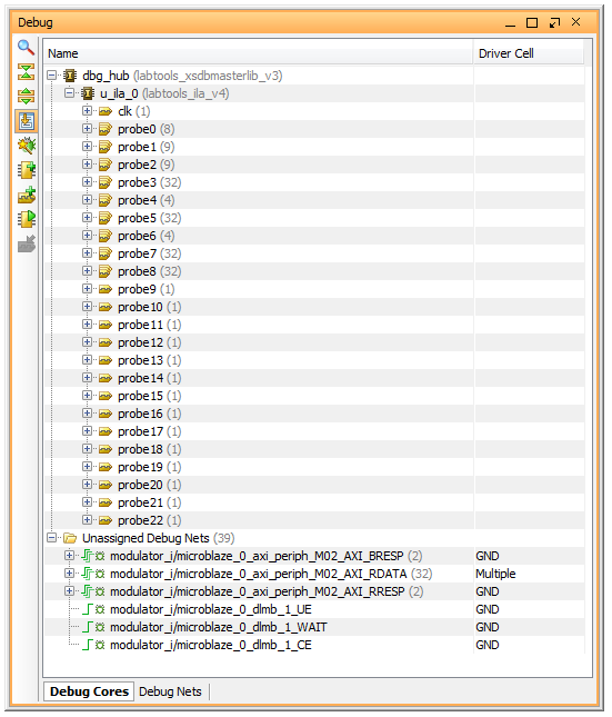 Choosing the flow depends on your preferences and types of nets/signals that you are interested in debugging. In this tutorial we will explain the Netlist Insertion Debug Probing Flow on the Modulator IP integrated design.