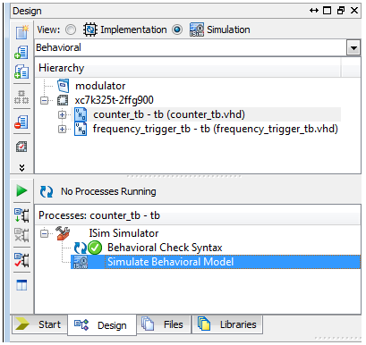 9. In the Processes window, expand ISim Simulator and double-click on the Behavioral Check Syntax